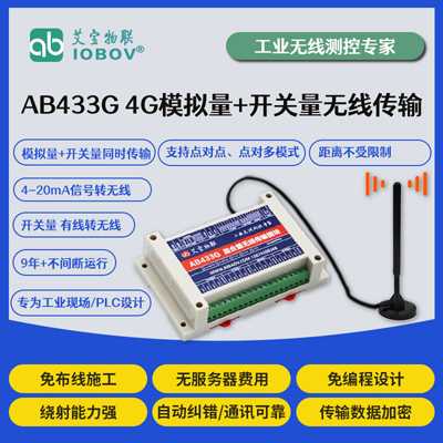 AB433G具有開關量模擬量無線傳輸功能,光電隔離輸入,繼電器輸出,支持4-20mA,0-5V或者0-10V等傳感器信號??蓪點的開關量模擬量信號無線傳輸?shù)紹點,同時可將B點的開關量模擬量信號無線傳輸?shù)紸點。可以工作在點對點模式:A和B兩個點之間互相透傳開關量模擬量;也可以工作在點對多模式:A點同時和B點、C點、D點...之間無線透傳開關量模擬量。AB433G無線4G終端采用4G通信技術,抗干擾能力強,可替代電纜,無需挖溝布線,無傳輸距離限制,大大降低企業(yè)人力物力成本,減少施工和維護難度。 AB433G無線4G終端具有4/8/16/32路等多種開關量模擬量輸入/輸出點數(shù),點數(shù)可根據(jù)用戶需求自由配置。傳輸距離不受限制。相比GPS通信傳輸速度快,延遲小。使用4G通信方式,用戶連接服務器是免費的,只需支付通信費用即可。針對工業(yè)用戶,全工業(yè)級防雷設計,久經(jīng)工業(yè)現(xiàn)場考驗,質(zhì)量穩(wěn)定可靠。免編程,撥碼開關即可設置所有工作參數(shù)。產(chǎn)品體積小巧,標準導軌安裝。廣泛應用于工業(yè)自動化、廠礦、電力、水利、環(huán)保、農(nóng)業(yè)、交通、軍工、安防等領域。 |