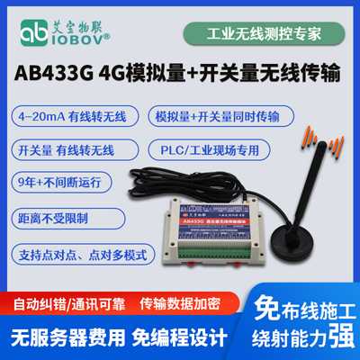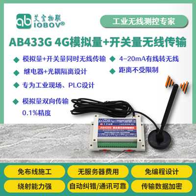 | AB433G1G:發(fā)送模塊4AI+4AO+4DI+4DO,接收模塊4AI+4AO+4DI+4DO。無線4G網(wǎng)絡。 |