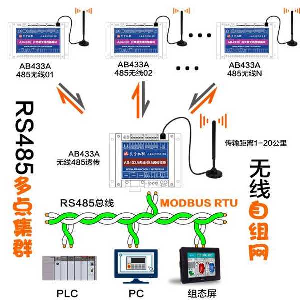 AB433A 485信號無線模塊具有 RS485 和 RS232 透傳功能??梢怨ぷ髟邳c對點模式:將 A 點的RS485 或者 RS232 信號無線傳輸?shù)?B 點, 同時可將 B 點的 RS485 或者 RS232 信號無線傳輸?shù)?A 點。 也可以工作在點對多模式:實現(xiàn)A、B、C、D...點之間RS485和RS232信號的透傳。