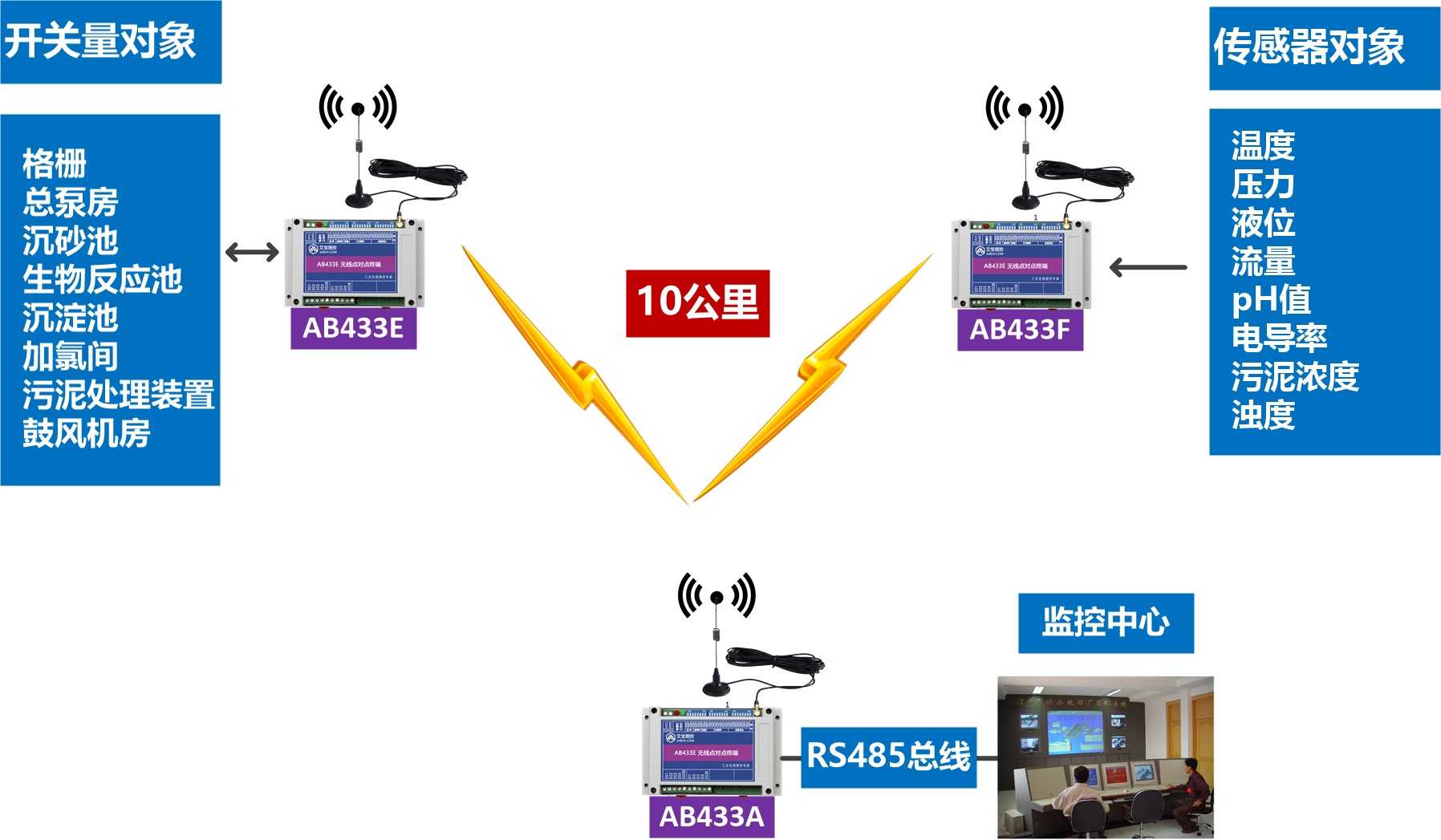 開關量控制模塊:AB433E系列產品根據一定的程序、時間和邏輯關系集中控制污水處理過程中的設備起停,對遠程現(xiàn)場的運行設備進行監(jiān)測和控制,與控制中心通過無線連接;