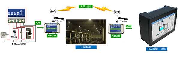 客戶需求的其實(shí)是一個(gè)典型的模擬量無線點(diǎn)對(duì)點(diǎn)傳輸方案,使用艾寶物聯(lián)的AB433F模擬量無線終端,可以解決客戶的問題。給4-20mA模擬傳感器安裝一個(gè)AB433F無線終端,AB433F可同時(shí)采集四路4-20mA模擬量信號(hào)。在監(jiān)控中心安裝一個(gè)AB433F無線終端,還原出四路4-20mA模擬量信號(hào)。這樣,四路模擬信號(hào)就就可以無線傳輸?shù)絇LC觸摸一體機(jī)了。