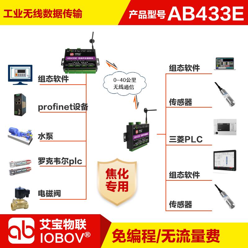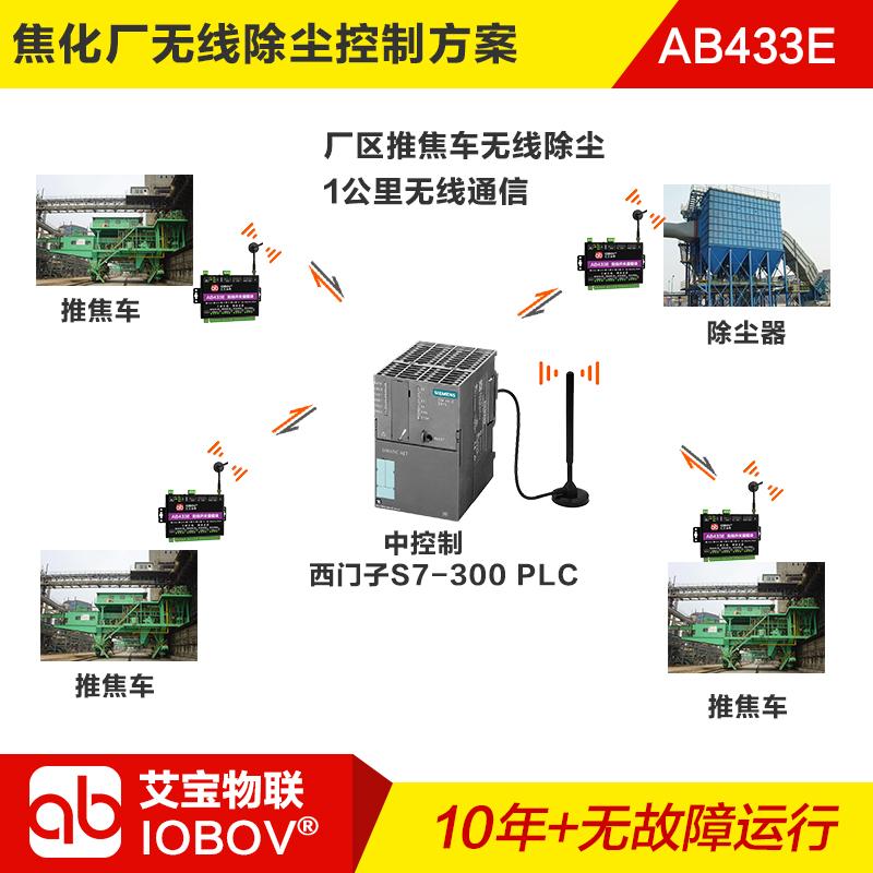 艾寶物聯(lián)采用AB433E無線開關(guān)量傳輸器解決此難題:在推焦車上裝發(fā)射端,中控室接接收端至西門子S7-300 PLC。如此,監(jiān)控中心可遠(yuǎn)程實(shí)時控制推焦車及除塵風(fēng)機(jī),提升效率與安全,省去布線煩惱與高昂維護(hù)費(fèi)。