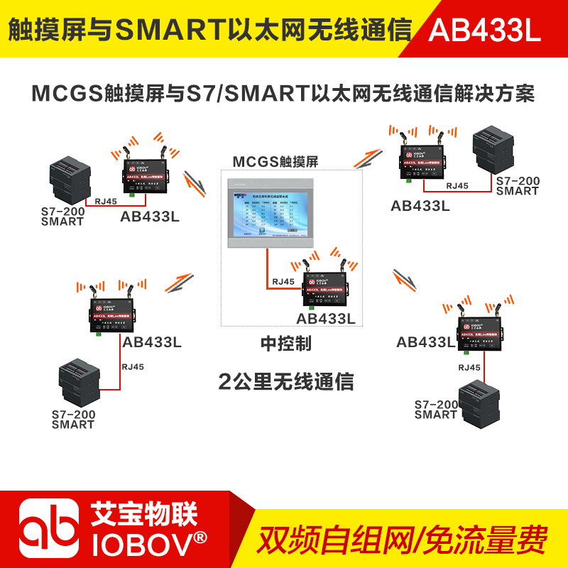 MCGS觸摸屏作為中心,通過AB433L無線設(shè)備與3臺西門子S7-200 Smart PLC建立無線通訊網(wǎng)絡(luò)。