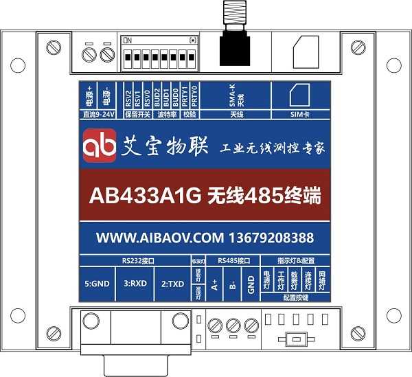 | AB433A1G表示:無線模塊具有RS232和RS485接口,自動二選一,同一時刻只能一個接口工作;無線4G網(wǎng)絡。 |