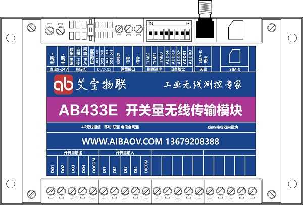 | AB433E1G:發(fā)送模塊4DI+4DO,接收模塊4DI+4DO。無線4G網(wǎng)絡(luò)。 |