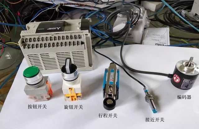 工控中常使用的輸入元器件主要是一些開(kāi)關(guān),有旋鈕開(kāi)關(guān)、按鈕開(kāi)關(guān)、行程開(kāi)關(guān)、接近開(kāi)關(guān)、編碼器等,如下圖所示:
