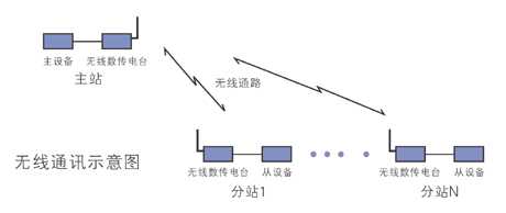 使用透明無線數(shù)傳電臺(tái)組成點(diǎn)對(duì)多點(diǎn)的通信系統(tǒng)的示意圖如下圖所示。