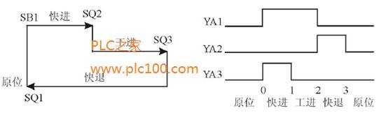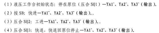 液壓工作臺的整個工作過程可劃分為:原位(SB1 )、快進(SQ2 )、工進(SQ3)和快退( SQ1)四步;各步電磁閥YA1, YA2, YA3的狀態(tài)如圖所示。