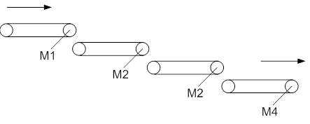 有一個(gè)用四條皮帶運(yùn)輸機(jī)的傳輸系統(tǒng),分別用四臺(tái)電動(dòng)機(jī)M1~M4驅(qū)動(dòng),如圖1所示??刂埔笕缦拢?/span>