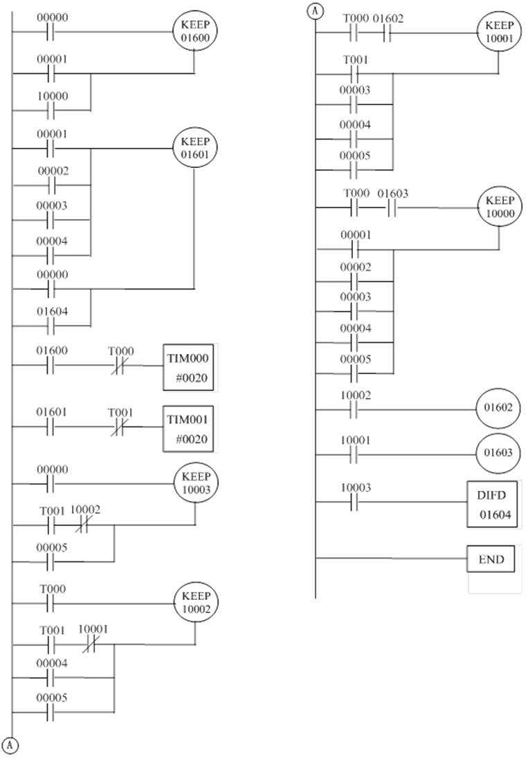 解答:根據(jù)要求,每隔2s啟動(dòng)一條皮帶,可由脈沖發(fā)生器來(lái)設(shè)定時(shí)間間隔。設(shè)00000為啟動(dòng)按鈕,00001為停止按鈕,00002、00003、00004、00005分別為四條皮帶的故障停車(chē)信號(hào);10000為第1條皮帶驅(qū)動(dòng),10001為第2條皮帶驅(qū)動(dòng),10002為第3條皮帶驅(qū)動(dòng),10003為第4條皮帶驅(qū)動(dòng)。中間繼電器01602和01603的作用是在啟動(dòng)過(guò)程中,連鎖接點(diǎn)10002、10001的有效時(shí)間滯后1個(gè)掃描周期,以保證啟動(dòng)順序;01604的作用是在4條傳送帶均停止后,復(fù)位停止繼電器01601,使系統(tǒng)復(fù)原,如圖2所示。