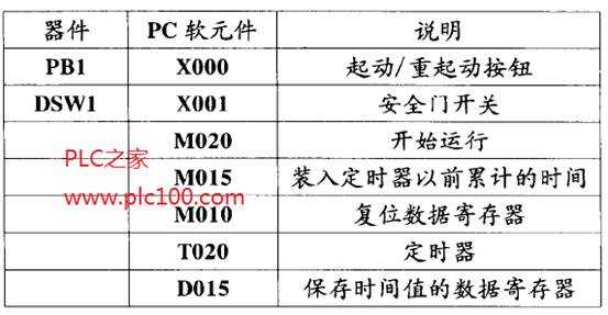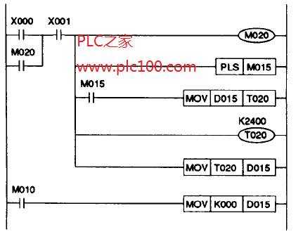 當(dāng)兩個(gè)輸入出現(xiàn)時(shí),輔助繼電器M020接通并自鎖。定時(shí)器T020開(kāi)始計(jì)時(shí),同時(shí)當(dāng)前時(shí)間數(shù)據(jù)送入寄存器DO15。在T020運(yùn)行期間的任何時(shí)刻,如果滑門(mén)打開(kāi),鎖定的M020繼電器斷開(kāi),定時(shí)器停止。