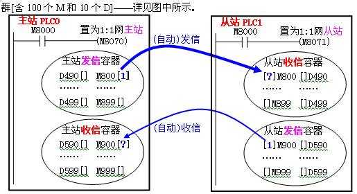 ●默認(rèn)工作于“普通容器”——每臺PLC:“發(fā)信容器”1群[含100個(gè)M和10個(gè)D],“收信容器”