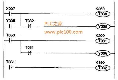 定時器T031定時結(jié)束后,高速輸出Y006, MTR2被取消。接著定時器T032提供15秒時間使洗衣機(jī)減速。
