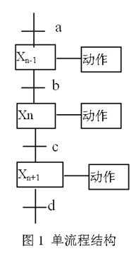 在圖1中,當(dāng)n-1為活動步時(shí),轉(zhuǎn)換條件b成立,則轉(zhuǎn)換實(shí)現(xiàn),n步變?yōu)榛顒硬?,同時(shí)n-1步關(guān)斷。由此可見,第n步成為活動步的條件是:Xn-1=1,b=1;第n步關(guān)斷的條件只有一個(gè)Xn+1=1。用邏輯表達(dá)式表示功能流程圖的第n步開通和關(guān)斷條件為: