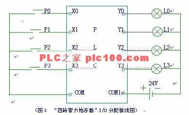 2、按照I/O分配接線圖接線。I/O分配接線圖如圖3所示,圖中P0—P3為四個按鈕,X0—X3為輸入繼電器接口,Y0—Y3為輸出繼電器接口,COM為輸入繼電器的公共端,在內(nèi)部已接電源負極,COM1為輸出繼電器分區(qū)的公共端,應接24V直流電源的正極。千萬注意不能將COM和COM1連接在一起,否則,將造成電源短路,燒壞保險絲。因本實驗臺本身沒有提供電鈴,所以電鈴在圖中未畫出,實際應用時可用相應的輸出接繼電器再控制電鈴。