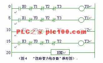 4、為了幫助初學者了解“四路智力搶答器”的工作原理,特附上梯形圖如圖4所示。