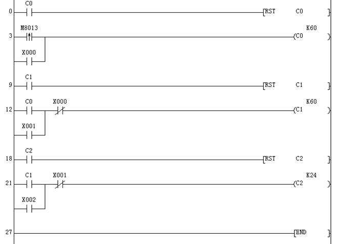 工作過程:將C0、C1、C2計數(shù)器輸出到顯示器上,便可得到一電子時鐘。其中C1為秒脈沖,當(dāng)C1為60S、C2為60min、C3為24h時分別產(chǎn)生進(jìn)位信號。