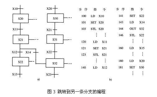 在某種情況下,要求程序從一條分支的某個狀態(tài)跳轉到另一條分支的某個狀態(tài)繼續(xù)執(zhí)行。此時,可以采用跳轉到另一條分支的編程方法,如圖3所示。