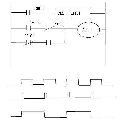 待分頻的脈沖信號加在X000端,設(shè)M101和Y000的初始狀態(tài)為“0”。當(dāng)?shù)谝粋€脈沖信號的上升沿到來時,M101產(chǎn)生一個單脈沖(如圖所示),Y000被置“1”,當(dāng)M101置“0”時,Y000仍保持置“1”;當(dāng)?shù)诙€脈沖信號的上升沿到來時,M101又產(chǎn)生一個單脈沖(如圖所示),M101常閉觸點斷開,使Y000由“1”變“0”,當(dāng)M101置“0”時,Y000仍保持置“0”直到第三個脈沖到來。當(dāng)?shù)谌齻€脈沖到來時,重復(fù)上述過程。由此可見,X000每送兩個脈沖,Y000產(chǎn)生一個脈沖,完成對輸入信號的二分頻。