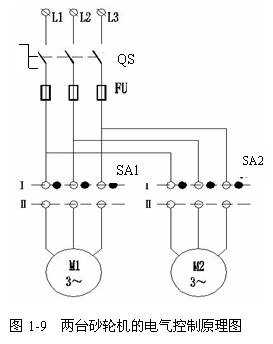 砂輪機(jī)通常用于修磨刀具。高速旋轉(zhuǎn)的砂輪裝在電動機(jī)的軸上,與電動機(jī)轉(zhuǎn)子同速旋轉(zhuǎn)。雖然它也只要電機(jī)單向旋轉(zhuǎn),但由于工作時粉塵太多,不宜采用開啟式負(fù)荷開關(guān),而封閉式負(fù)荷開關(guān)又不適宜頻繁操作,所以砂輪機(jī)一般采用萬能轉(zhuǎn)換開關(guān)控制。圖1-9時兩臺砂輪機(jī)的電路圖。