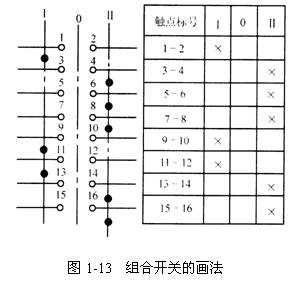 萬能轉(zhuǎn)換開關(guān)在電氣原理圖中的畫法,如圖1-13所示。圖中虛線表示操作位置,而不同操作位置的各對觸點通斷狀態(tài)與觸點下方或右側(cè)對應(yīng),規(guī)定用于虛線相交位置上的涂黑圓點表示接通,沒有涂黑圓點表示斷開。另一種是用觸點通斷狀態(tài)表來表示,表中以“+”(或“ ╳ ”)表示觸點閉合,“—”(或無記號)表示分?jǐn)唷?/span>