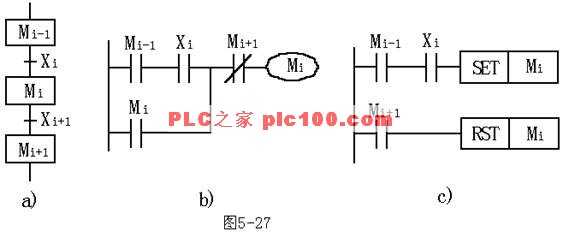 如圖5-27a所示Mi-1、Mi和Mi+l是功能表圖中順序相連的3步,Xi是步Mi之前的轉換條件。