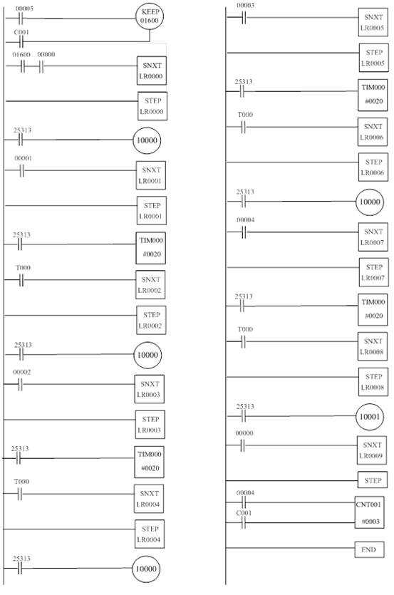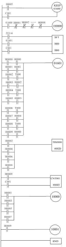 解:設(shè)對(duì)應(yīng)A、B、C、D、E點(diǎn)的檢測(cè)開(kāi)關(guān)由00000、00001、00002、00003、00004點(diǎn)輸入,00005為啟動(dòng)按鈕;小車右行為10000,左行為10001。用移位指令和步進(jìn)指令實(shí)現(xiàn)的梯形圖分別見(jiàn)圖1和圖2。