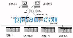PLC1和和PLC2分別為兩個GE FANUC 90-30系列PLC,通過Genius總線控制器利用Genius總線網連接,以實現(xiàn)雙機熱冗余??紤]到系統(tǒng)成本,在遠程I/Oversamax通用擴展式I/O結構,利用Genius網絡接口單元,掛到整個Genius總線網中,為遠程控制提供靈活的I/O結構。由于90-30系列PLC支持以太網通訊,在系統(tǒng)中增加一個8口以太網HUB,PLC和上位機分別將以太網線接入入HUB,實現(xiàn)上位機與現(xiàn)場的高速通訊。
