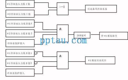 在系統(tǒng)中,每臺循泵的冷卻水管路上分別設置兩個冷卻水壓力低Ⅱ值和一個冷卻水壓力低Ⅰ值。冷卻水壓力低Ⅰ值作為啟動備用冷卻水泵的條件。冷卻水壓力低Ⅱ值作為啟動循泵的閉鎖條件,當循泵未運行時,兩個冷卻水壓力低Ⅱ值都動作,不允許啟泵,當循泵運行時,兩個冷卻水壓力低Ⅱ值都動作后,延時20s,跳閘循泵。冷卻水壓力低Ⅱ值的閉鎖條件可CRT上選擇是否投入,當發(fā)生冷卻水壓力開關故障時可屏蔽,便于檢修工作。