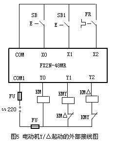 PLC的輸入信號(hào):起動(dòng)按鈕SB1(X1),停止按鈕SB(X0),熱繼電器常開觸點(diǎn)FR(X2)。PLC的輸出信號(hào):主接觸器KM(Y0),起動(dòng)接觸器KMY(Y1),運(yùn)行接觸器KM△(Y2)。定時(shí)器(T0)。根據(jù)上述I/O信號(hào),可畫出PLC的外部接線圖,如圖5所示。
