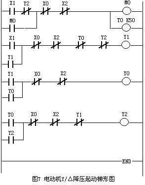 根據(jù)上述邏輯函數(shù)表達(dá)式以及邏輯函數(shù)表達(dá)式與梯形圖的對(duì)應(yīng)關(guān)系,可畫出圖7所示的梯形圖。