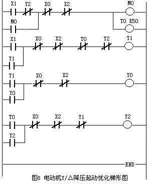 根據(jù)圖7所示的梯形圖,可以采用輔助繼電器進(jìn)行優(yōu)化,如圖8所示。