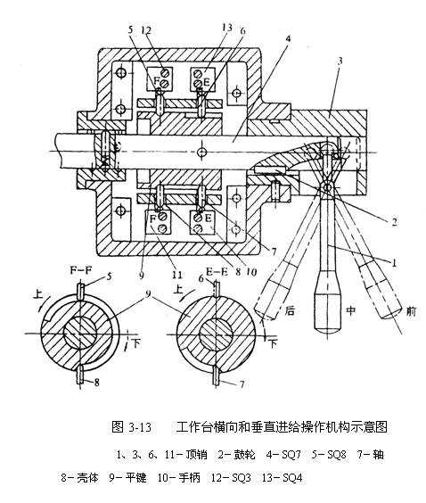 操作手柄:操縱工作臺(tái)橫向聯(lián)合向進(jìn)給運(yùn)動(dòng)和垂直進(jìn)給運(yùn)動(dòng)的手柄為十字手柄。它有兩個(gè),分別裝在工作臺(tái)左側(cè)的前、后方。它們之間有機(jī)構(gòu)聯(lián)接,只需操縱其中的任意一個(gè)即可。手柄有上、下、前、后和零位共五個(gè)位置。進(jìn)給也是由進(jìn)給電動(dòng)機(jī)M3拖動(dòng)。