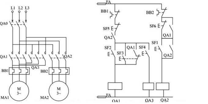 按動SF1使QA2得電自鎖,則潤滑油泵MA2啟動,再按動SF2,可使QA1得電自鎖,主軸電動機MA1正向啟動。按SF3可使QA1得電,即主軸電動機MA1正向點動;按SF4可使QA3得電,即主軸電動機MA1反向點動。當潤滑油泵要停轉(zhuǎn)時,必須先使主軸電動機先停止,即QA1常開斷開,再按動SF6。