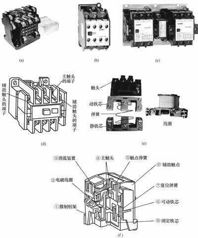 (d)交流接觸器的外形結(jié)構(gòu)說(shuō)明 (e)(f)接觸器內(nèi)部結(jié)構(gòu)