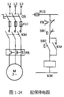 在自動(dòng)控制電路中,起動(dòng)按鈕SB2,停止按鈕SB1和交流接觸器KM組成了起動(dòng)、保持、停止(簡稱起保停電路)典型控制電路。圖1-24是一個(gè)常用的最簡單的控制電路。