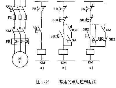 起保停電路實(shí)現(xiàn)了電動(dòng)機(jī)的連續(xù)運(yùn)行控制。但有些生產(chǎn)機(jī)械要求按鈕按下時(shí),電動(dòng)機(jī)運(yùn)轉(zhuǎn),松開按鈕時(shí),電動(dòng)機(jī)就停止,這就是點(diǎn)動(dòng)控制。如圖1-25圖a所示。圖b、c是實(shí)現(xiàn)點(diǎn)動(dòng)與連續(xù)運(yùn)行的電路。