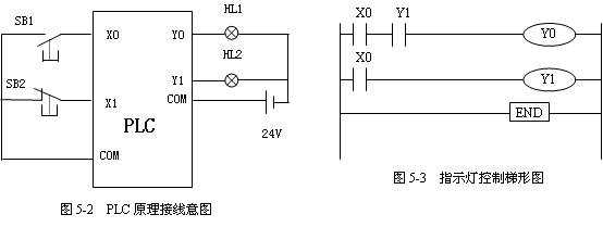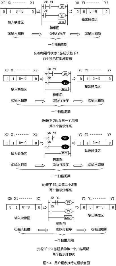 圖5-2為PLC接線圖,圖5-3為控制梯形圖。圖5-4描述了每個(gè)掃描周期程序的執(zhí)行過程。按鈕SB2雖然在程序中沒有使用,但其狀態(tài)仍影響其對(duì)應(yīng)編號(hào)的內(nèi)部輸入繼電器的狀態(tài)。圖(a)中,①輸入掃描過程,將兩個(gè)按鈕的狀態(tài)掃描后,存入其映像區(qū),由于SB2是停止按鈕,所以,即使沒有按下,其輸入回路也是閉合的,因此,X1存“1”(ON狀態(tài)),而其它位存“0”(OFF狀態(tài))。②執(zhí)行程序過程,程序根據(jù)所用到觸點(diǎn)的編號(hào)對(duì)應(yīng)的內(nèi)部繼電器狀態(tài)來運(yùn)算。由于X0處于OFF狀態(tài),因此,對(duì)應(yīng)的動(dòng)合觸點(diǎn)處于斷開狀態(tài),運(yùn)算結(jié)果是Y0、Y1處于OFF狀態(tài),其結(jié)果存入輸出映像區(qū),即Y0、Y1存“0”。③輸出刷新過程,根據(jù)映像區(qū)各位的狀態(tài)驅(qū)動(dòng)輸出設(shè)備,由于輸出映像區(qū)均為OFF狀態(tài),所以,輸出指示燈不能形成閉合回路,燈不亮。如果輸入不發(fā)生變化,內(nèi)部繼電器的狀態(tài)均不發(fā)生變化。圖(b)中,按下SB1按鈕后,X0輸入回路閉合。①輸入掃描將輸入狀態(tài)存入其映像區(qū),X0、X1均存“1”。②執(zhí)行程序過程,按照從左到右,從上到下的原則,逐條執(zhí)行。第一行,X0觸點(diǎn)閉合,但此時(shí),Y1的狀態(tài)為“0”,因此,Y1觸點(diǎn)為斷開狀態(tài),Y0沒能導(dǎo)通,其狀態(tài)為“0”。第二行,X0觸點(diǎn)閉合,所以,Y1的狀態(tài)為“1”。③輸出刷新過程,由于Y1呈導(dǎo)通狀態(tài),燈2亮。