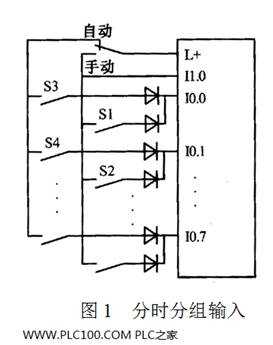 (1)分時分組輸入。 一般系統(tǒng)中設(shè)有“自動”和“手動”兩種工作方式,兩種方式不會同時執(zhí)行。將兩種方式的輸入分組,從而減少實際輸入點。如圖1所示。PLC通過I1.0識別“手動”和“自動”,從而執(zhí)行手動程序或自動程序。圖中的二極管用來切斷寄生電路。若圖中沒有二極管,轉(zhuǎn)換開關(guān)在“自動”,S1、S2、S3閉合,S4斷開,這時電流從L+端子流出,經(jīng)S3、S1、S2形成的寄生回路電流流入I0.1,使I0.1錯誤的變?yōu)?/span>ON。各開關(guān)串如入二極管后,則切斷寄生回路。