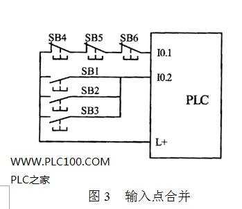 (3)輸入點合并。 將功能相同的常閉觸點串聯(lián)或?qū)⒊i_觸點并聯(lián),就只占用一個輸入點。一般多點操作的起動停止按鈕、保護(hù)、報警信號可采用這種方式。如圖3所示。