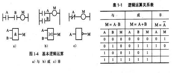 圖1—4中的A,B為輸入邏輯變量,M為輸出邏輯變量,它們之間的“與”、“或”、“非”邏輯運(yùn)算關(guān)系如表1.1所示。用繼電器電路或梯形圖可以實(shí)現(xiàn)基本邏輯運(yùn)算,觸點(diǎn)的串聯(lián)可實(shí)現(xiàn)“與”運(yùn)算,觸點(diǎn)的并聯(lián)可實(shí)現(xiàn)“或”運(yùn)算,用常閉觸點(diǎn)控制線圈可實(shí)現(xiàn)“非”運(yùn)算(見(jiàn)圖1-4)。多個(gè)觸點(diǎn)的串、并聯(lián)電路可以實(shí)現(xiàn)復(fù)雜的邏輯運(yùn)算,例如圖l-3中的繼電器電路實(shí)現(xiàn)的邏輯運(yùn)算可用邏輯代數(shù)表達(dá)式表示為