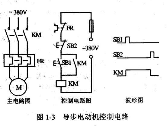 圖1—3是用交流接觸器控制異步電動(dòng)機(jī)的主電路、控制電路和有關(guān)的波形圖。接觸器的結(jié)構(gòu)和工作原理與繼電器的基本相同,區(qū)別僅在于繼電器觸點(diǎn)的額定電流較小,而接觸器是用來控制大電流負(fù)載的,例如它可以控制額定電流為幾十安至幾千安的異步電動(dòng)機(jī)。按下起動(dòng)按鈕SBl,它的常開觸點(diǎn)接通,電流經(jīng)過SBl的常開觸點(diǎn)和停止按鈕SB2、作過載保護(hù)用的熱繼電器FR的常閉觸點(diǎn),流過交流接觸器KM的線圈,接觸器的銜鐵被吸合,使主電路中的3對(duì)常開觸點(diǎn)閉合,異步電動(dòng)機(jī)M的三相電源被接通,電動(dòng)機(jī)開始運(yùn)行,控制電路中接觸器KM的輔助常開觸點(diǎn)同時(shí)接通。放開起動(dòng)按鈕后,SBl的常開觸點(diǎn)斷開,電流經(jīng)KM的輔助常開觸點(diǎn)和SB2、FR的’常閉觸點(diǎn)流過KM的線圈,電動(dòng)機(jī)繼續(xù)運(yùn)行。KM的輔助常開觸點(diǎn)實(shí)現(xiàn)的這種功能稱為“自鎖”或“自保持”,它使繼電器電路具有類似于R-S觸發(fā)器的記憶功能。