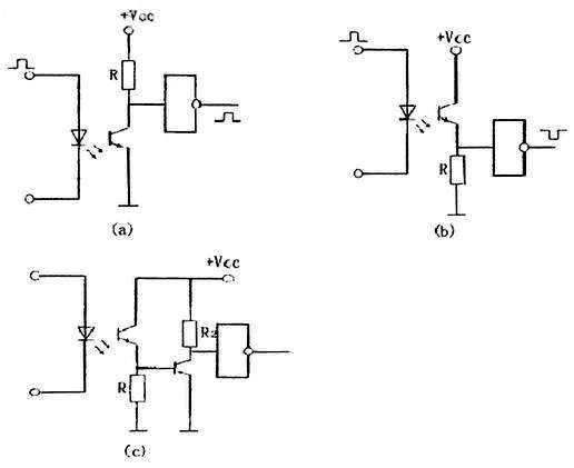 (2) 光電耦合輸出電路如圖3所示。為了得到和輸入同相的信號(hào),可以采用圖3(a)形式。若要求輸出和輸入反相,可以接成圖3(b)形式。當(dāng)輸出電路所驅(qū)動(dòng)的元件較多時(shí),可以加接一級(jí)晶體管作為驅(qū)動(dòng)功率放大,其接法如圖3(c)所示。有時(shí)為了獲得更好的輸出波形,輸出信號(hào)可經(jīng)施密特電路整形。
