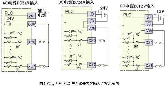 FX2N系列PLC只有直流輸入,且在PLC內部,將輸入端與內部24V電源正極相連、COM端與負極連接,參見圖1所示。這樣,其無源的開關類輸入,不用單獨提供電源。這與其它類PLC有很大區(qū)別,在今后使用其它PLC時,要注意仔細閱讀其說明書。