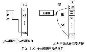 接近開關指本身需要電源驅動,輸出有一定電壓或電流的開關量傳感器。開關量傳感器根據(jù)其原理分有很多種,可用于不同場合的檢測,但根據(jù)其信號線可以分成三大類:兩線式、三線式、四線式。其中四線式有可能是同時提供一個動合觸點和一個動斷觸點,實際中只用其中之一;或者是第四根線為傳感器校驗線,校驗線不會與PLC輸入端連接的。因此,無論那種情況都可以參照三線式接線。圖2為PLC與傳感器連接的示意圖。