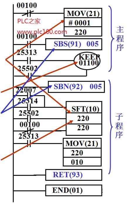 (2) 當(dāng)00100為ON時(shí),執(zhí)行主程序中的指令SBS,中斷執(zhí)行主程序,轉(zhuǎn)去執(zhí)行子程序 005: