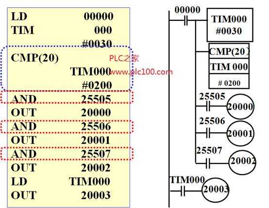 當(dāng)00000為ON時(shí),TIM000開(kāi)始定時(shí)、且開(kāi)始執(zhí)行CMP指令。