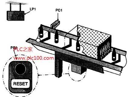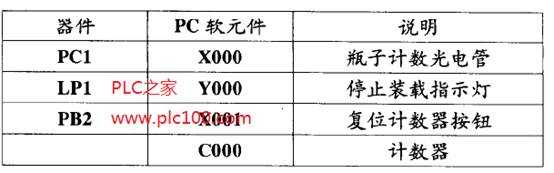 因?yàn)橛?jì)數(shù)器要保存它的數(shù)據(jù),所以需要一種復(fù)位當(dāng)前計(jì)數(shù)值的方法,可以用“復(fù)位”按鈕PB2實(shí)現(xiàn)。PB2對應(yīng)于輸入X001,它使計(jì)數(shù)器設(shè)定為Oo "STOP"燈關(guān)斷,整個(gè)系統(tǒng)準(zhǔn)備下一批3000個(gè)瓶子經(jīng)過。