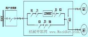 ?。?/span>1)用戶要求高壓變頻器在出現(xiàn)故障停機時能快速自動切換到工頻旁路運行,筆者給高壓變頻器專門配置了可以實現(xiàn)自動旁路功能的旁路柜,如圖1所示,K1~K4為手動操作刀閘,J1~J3為高壓真空接觸器。在變頻器發(fā)生故障時,旁路柜可以在幾秒內(nèi)完成從變頻到工頻的轉(zhuǎn)換;而變頻器在工頻運行時,通過1個按鈕就可以實現(xiàn)變頻器從工頻到變頻的轉(zhuǎn)換。這樣的控制要求增加了變頻器整機控制邏輯的復雜性。