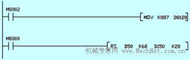 PLC RS232串口通信可使用無協(xié)議(RS指令)或?qū)S脜f(xié)議與上位機進行通信,本例中使用無協(xié)議與上位機進行通信,如圖四所示:D8120用于設(shè)定PLC通信格式,D50表示發(fā)送起始地址,K60表示發(fā)送字節(jié)數(shù)量,D150表示接收起始地址,K20表示接收字節(jié)數(shù)量。